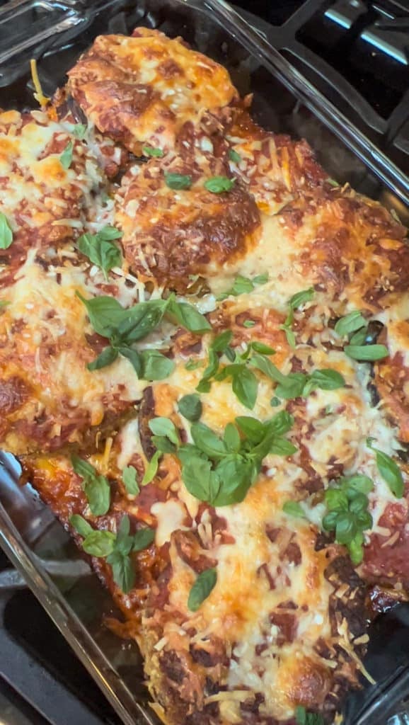 In a large casserole dish, spread a generous layer of marinara on the bottom. Then layer: eggplant slices, mozzarella, a spoonful of marinara, and shredded parmesan. Repeat an additional layer on top.