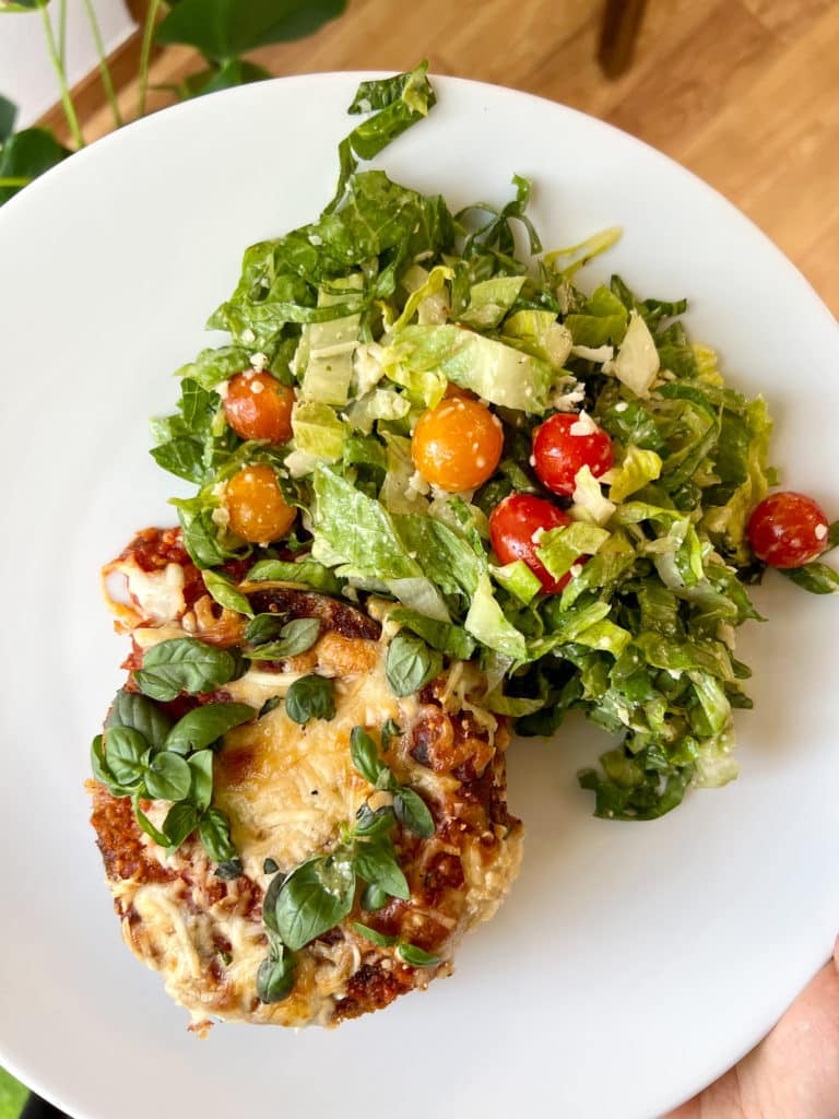 Eggplant is not my fave vegetable. I’ve never really found a great way to cook it and help it not be so… eggplant-y. UNTIL NOW. This eggplant parmesan is a tiny bit involved but so so worth it. Layers of crispy breaded eggplant, marinara, melty cheese, fresh herbs. Oomph. Definitely recommend!
