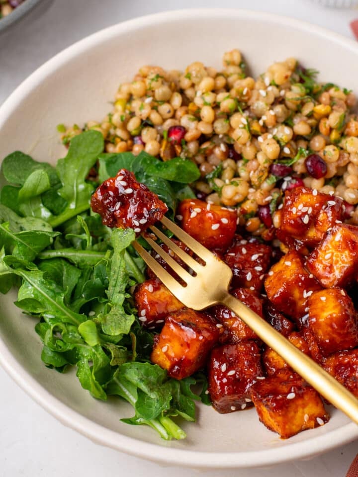Crispy tofu cubes tossed in sweet-and-spicy glaze and piled onto couscous pilaf… shhhh, do you hear that? Dinner is calling.