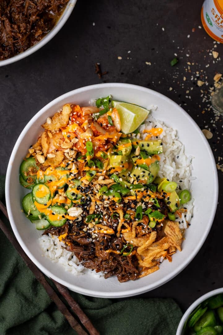 Saucy shredded beef, fluffy rice, tangy cucumbers, avocado, crispy onions and sriracha mayo make a truly unmatched Korean beef rice bowl. One of our absolute favorite dinners EVER!