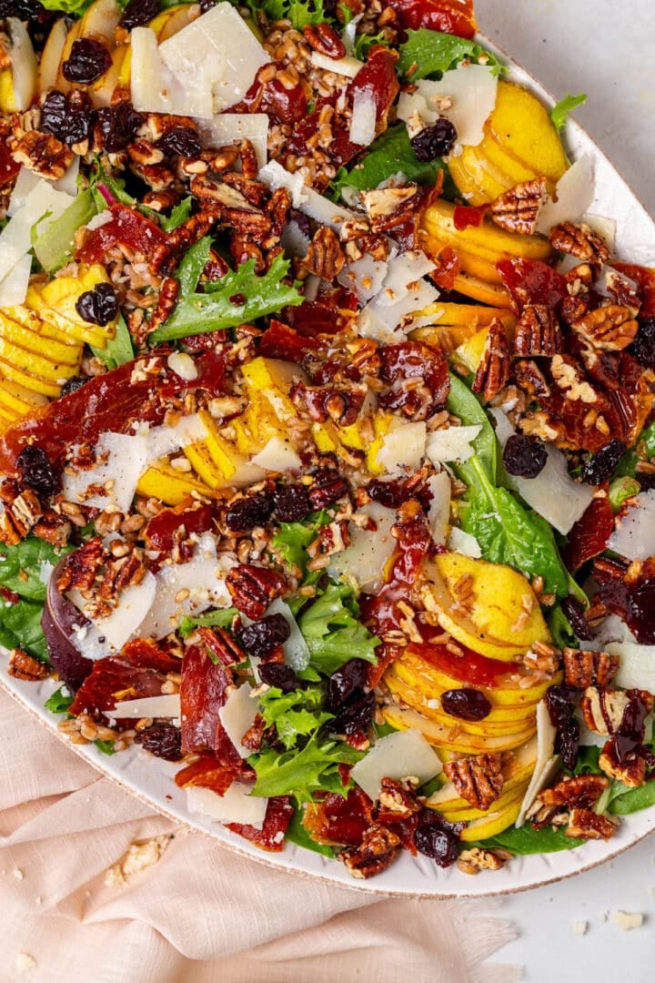 This pear and pecan salad is crisp, sweet, salty and full of texture. Itโs layered with juicy pears, candied pecans, dried cherries, farro, shaved parmesan and crispy prosciutto, all tossed in a bright honey lemon dressing. Itโs the perfect winter salad for easy lunches, weeknight dinners or holiday parties.