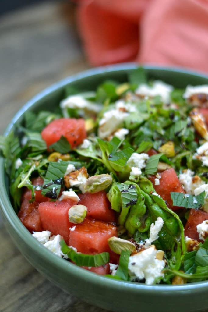 Versatility: this salad is amazingly versatile. Try cherries or strawberries instead of watermelon, goat cheese instead of feta, spinach or kale instead of arugula or pecans instead of pistachios! Make it your own!